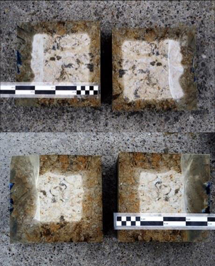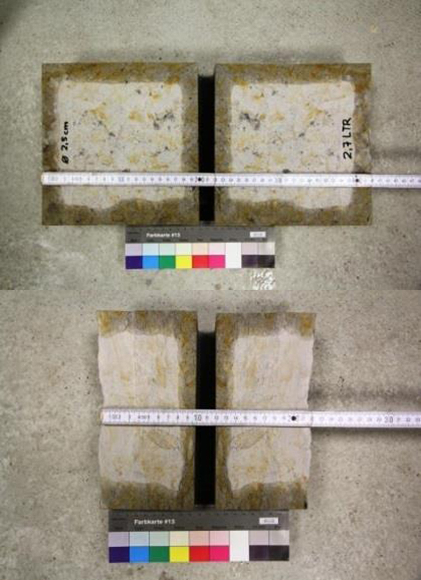 Fig. 3: Test cubes penetrated by Funcosil 300E with VCP and cut parallel to bedding immediately after the procedure (photos: E. Pummer).