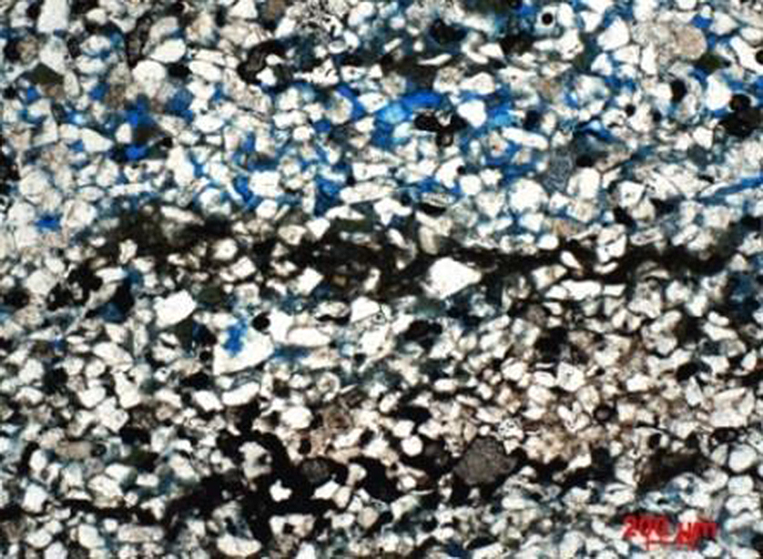 Fig. 1: Thin section image of Cotta sandstone (Nicols II) with light quartz grains and dark clay mineral layers