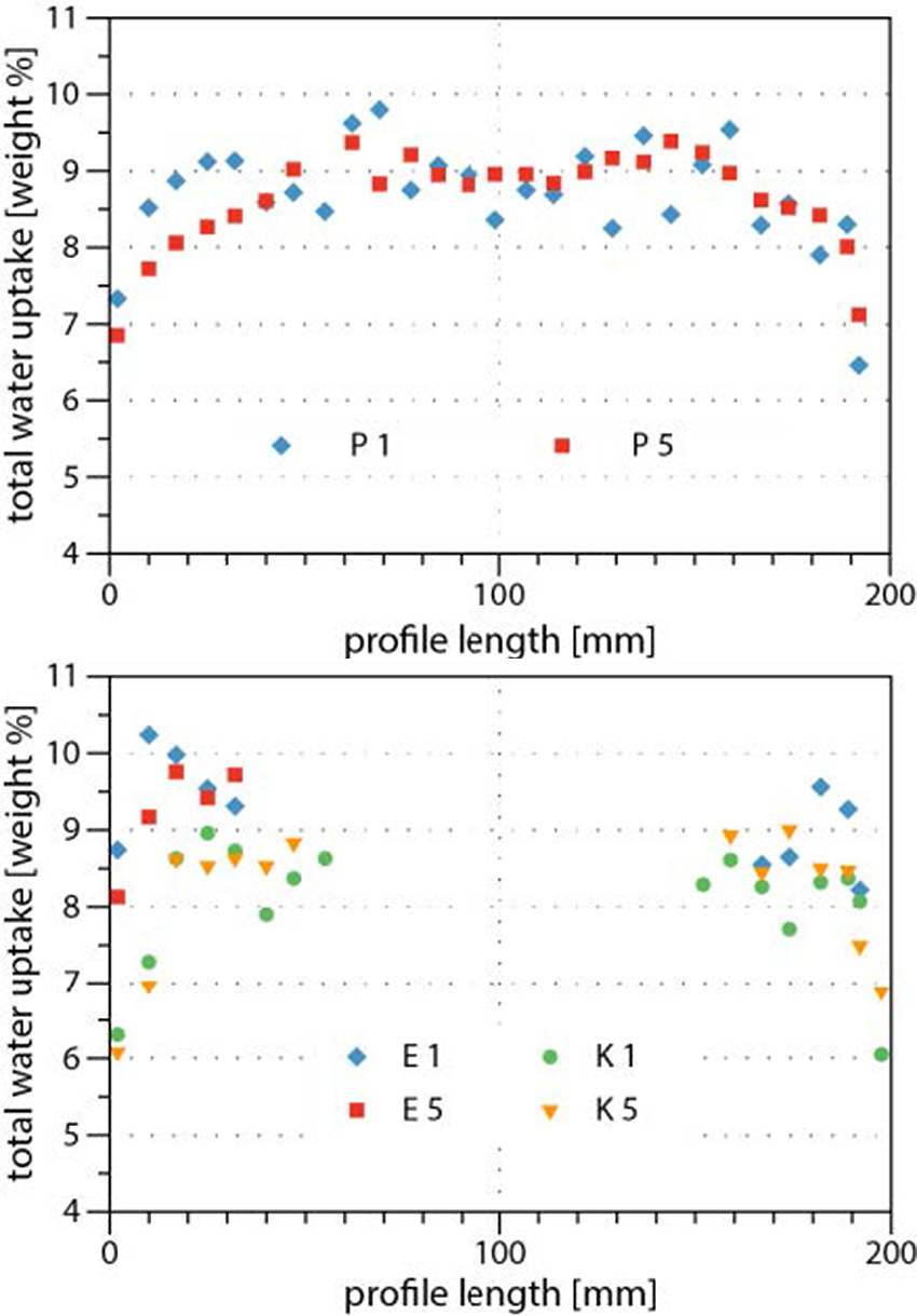 Fig. 9: Total water uptake profiles across the test cubes (measurements on 5 mm discs cut from drill cores; the discs from the inner core were not measured for cubes E and K).