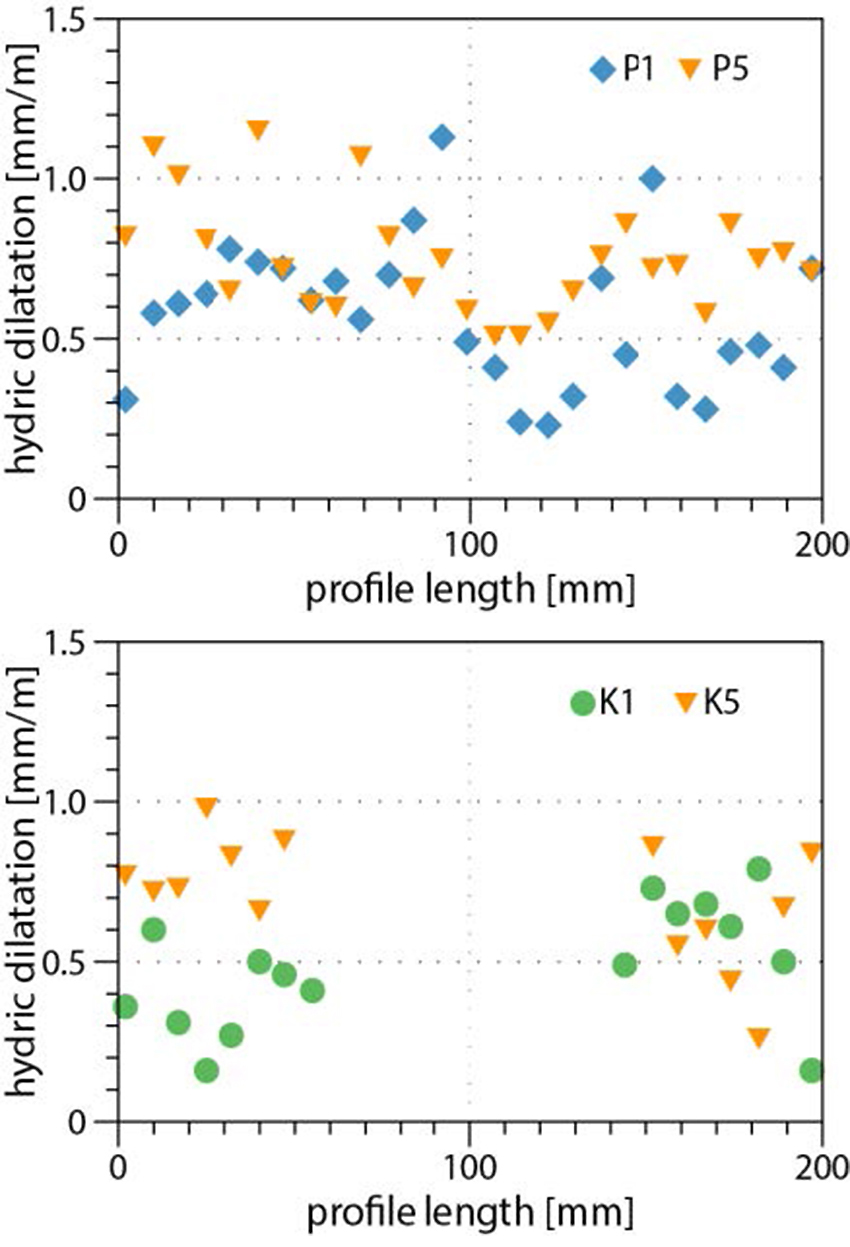 Fig. 10: Hydric dilatation profiles across the test cubes P and K (measurements on 5 mm discs cut from drill cores; 1 parallel, 5 normal to bedding). Discs from the inner core were not measured for cube K.