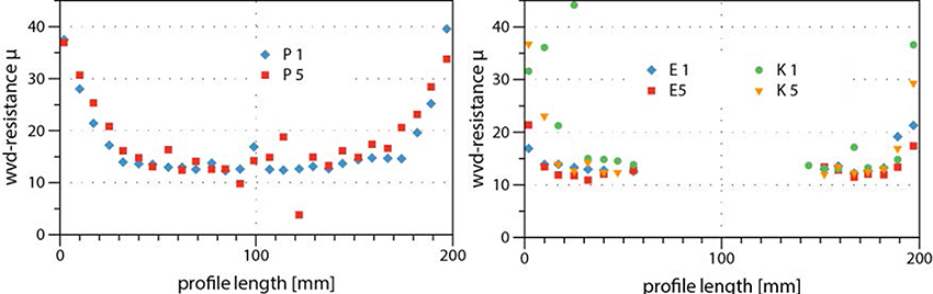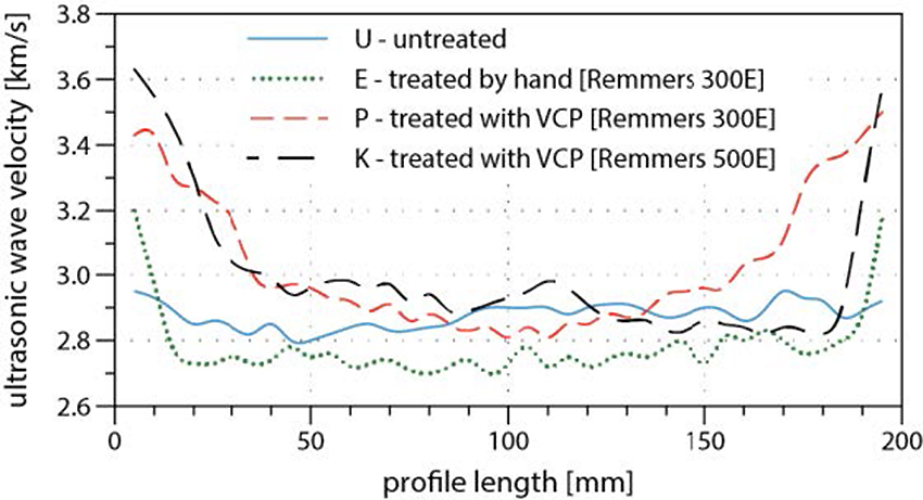 Fig. 5 displays the average values of all UWV profiles measured for the differently treated samples as well as for the untreated cube after 4 month of storage. The differences of UWV in the cores of the different sample cubes (deeper than 50-60 mm from surface) give the range of natural scattering in Cotta sandstone. As can be seen from the graphs, the hand-treated cube (E) shows the lowest change of UWV of all samples with effects limited to the first 10 mm from surface. Samples treated with VCP clearly show deeper and stronger effects (up to about 50 mm in case of Funcosil 300E (P) and about 30 mm in case of Funcosil 500E (K)). In contrast to the steep slope of the profiles of E and K in the outermost zone, the cube P treated with VCP and Funcosil 300E shows a more smooth profile. The profiles obtained from measurements in two different directions, both normal to the axis of the cores, are highly consistent.