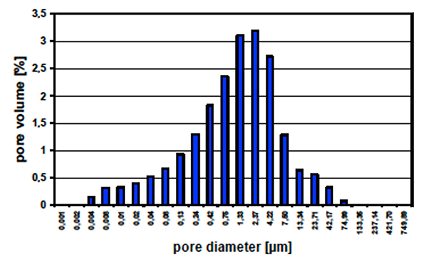 Fig. 2: Pore size distribution of Cotta sandstone used for the tests (U), according to MIP. Total porosity of this sample is 20.6 %.
