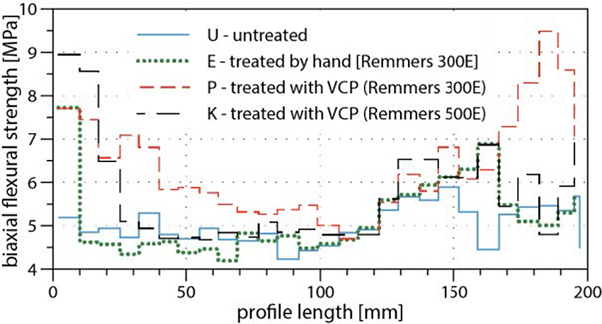 Fig. 6: Biaxial flexural strength profiles across the test cubes (average values for all measurements on 5 mm discs cut from drill cores).