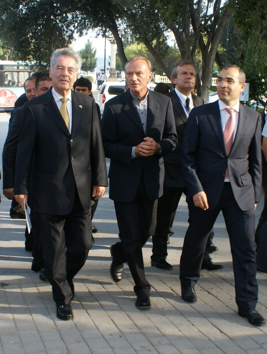 President Fischer showed himself very interested and pleased, that an Austrian company was contracted to restore such a important UNESCO world heritage monument by the Old City Administration „ICHERISHEHER“, which is directly subordinated to the cabinet of ministers. In the following „Business-Forum“ President Fischer met together with the Azerbaijan President Ilham Aliyev, where actually and prospective business relationships, especially in the concern of the planed NABUCCO pipeline, have been discussed and negotiated. In the beginning of the forum, President Aliyev pointed on the great confidence which the Azerbaijan country shows to Austrian companies and designated Atelier Erich Pummer, which has been contracted to restore the national Azerbaijan monument, the Maiden Tower.