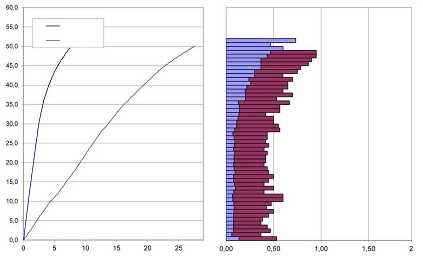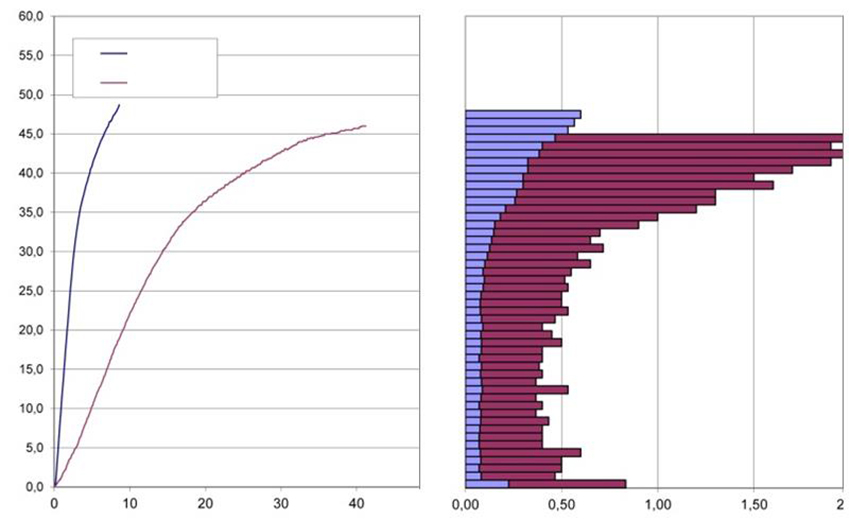 Drilling resistance profiles report the solidity in the different steps of depths. Figures 4 and 5 show examples for drilling resistance profiles. The analysis was done in steps of 1 mm; blue curve – before strengthening, red curve – after strengthening. The results report the successful VCP treatment with ESE 300E. The increase in solidity has been achieved uniformly from the surface right into the depths.