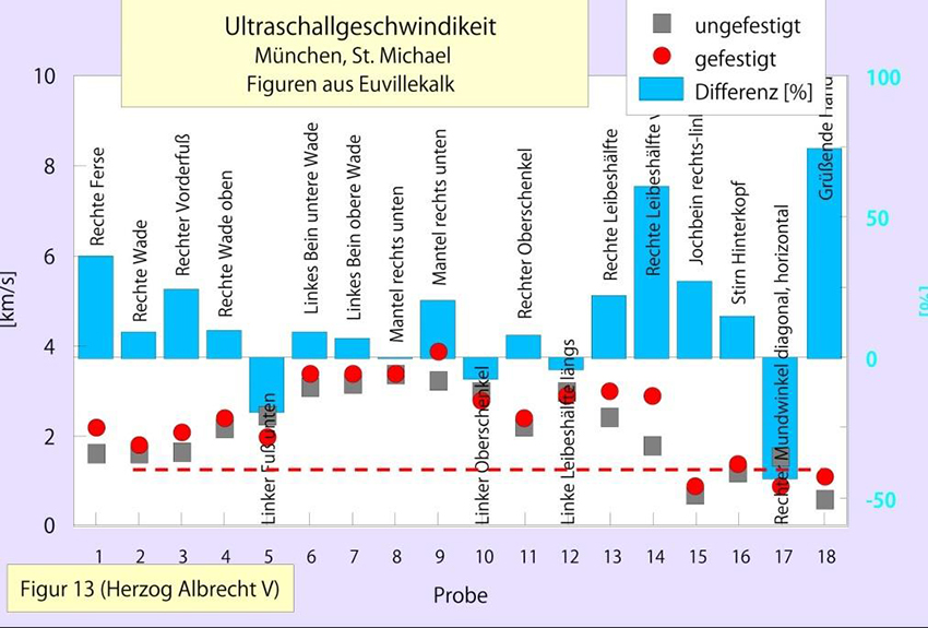 Fig. 10: Ultrasonic measurement report (grey – not consolidated, red – consolidated, blue – difference) by Dr. Eberhard Wendler, Munich (Germany).