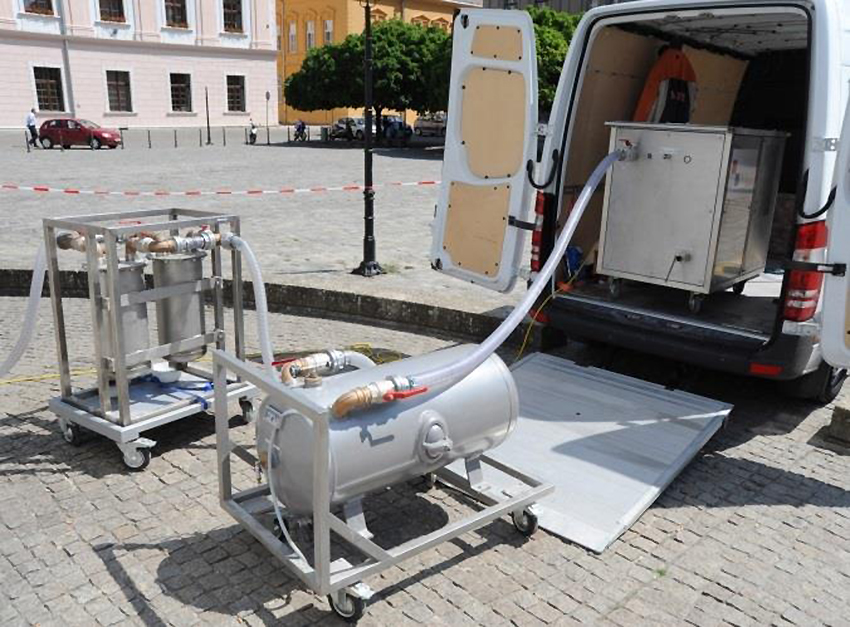 Fig. 1: Mobile VCP equipment, vacuum pump (in the back of the van), balance tank (middle), tank A&B combination (left; see Fig. 2 for further details).