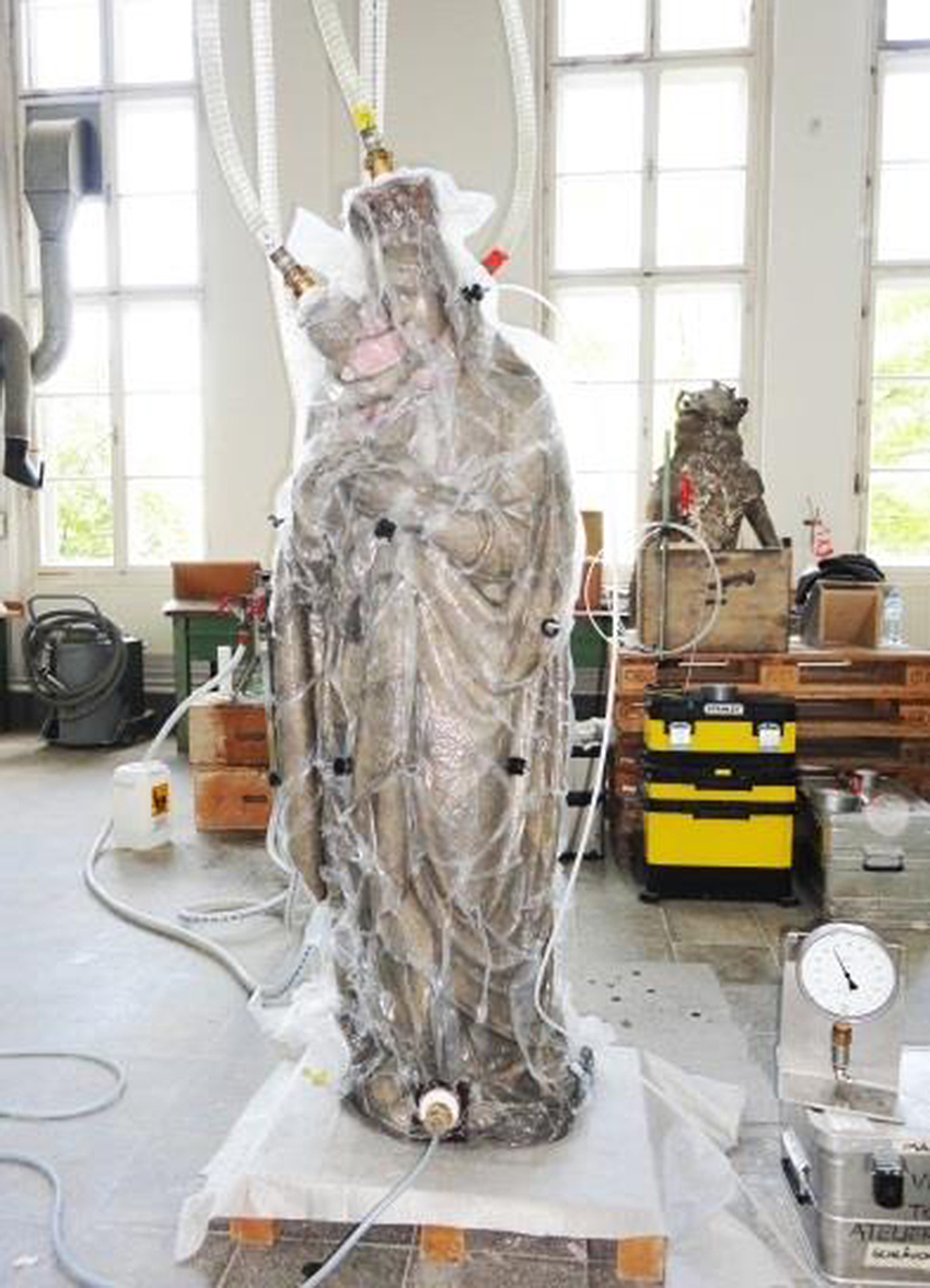 The sculpture was situated on a façade in the 7th district of Vienna. It is sculptured in a very porous calcareous Arenite with an original polychromic executed using an oil technique. The sculpture was demounted and was transported to the restoration laboratory of the University of Applied Art. The conservation and restoration of this statue are the subject of a diploma thesis with the task of strengthening the inner structure of the Madonna, which is covered by several layers of oil paint (2, see Paper for the 13th International Congress on the deterioration and Conservation of Stone 2016; M. Milchin et al. 2015). As a first step, the whole statue was wrapped in polypropylene fleece material (Fig. 3). This material had the function of protecting the surface of the statue but also to avoid leaking of the polyethylene foil used to create the airtight environment. On the highest points of the statue, purging valves were fixed with the foil. At the lowest position, inflow valves were mounted. A manometer for controlling the negative pressure inside the foil was also connected (Fig. 3).