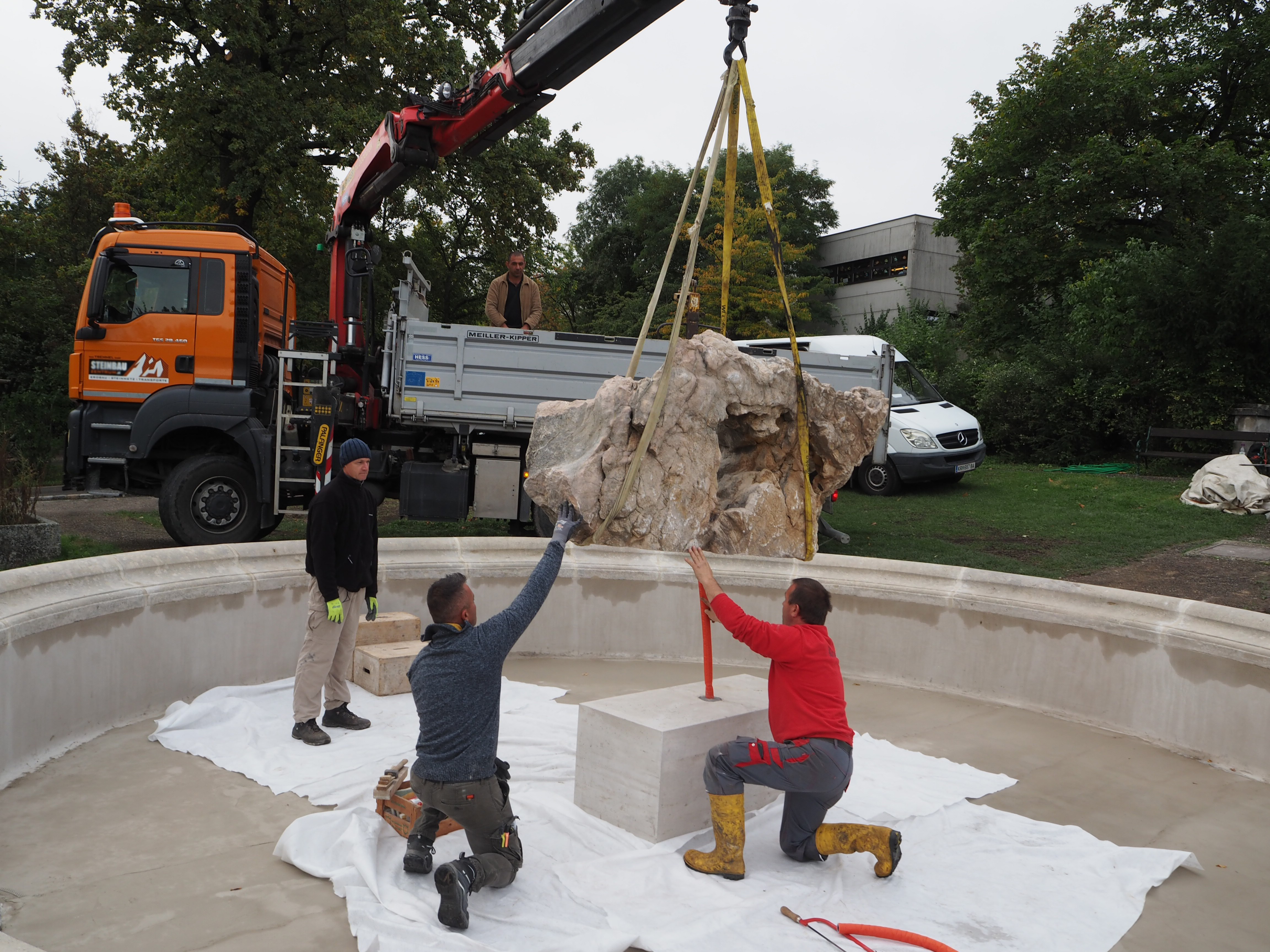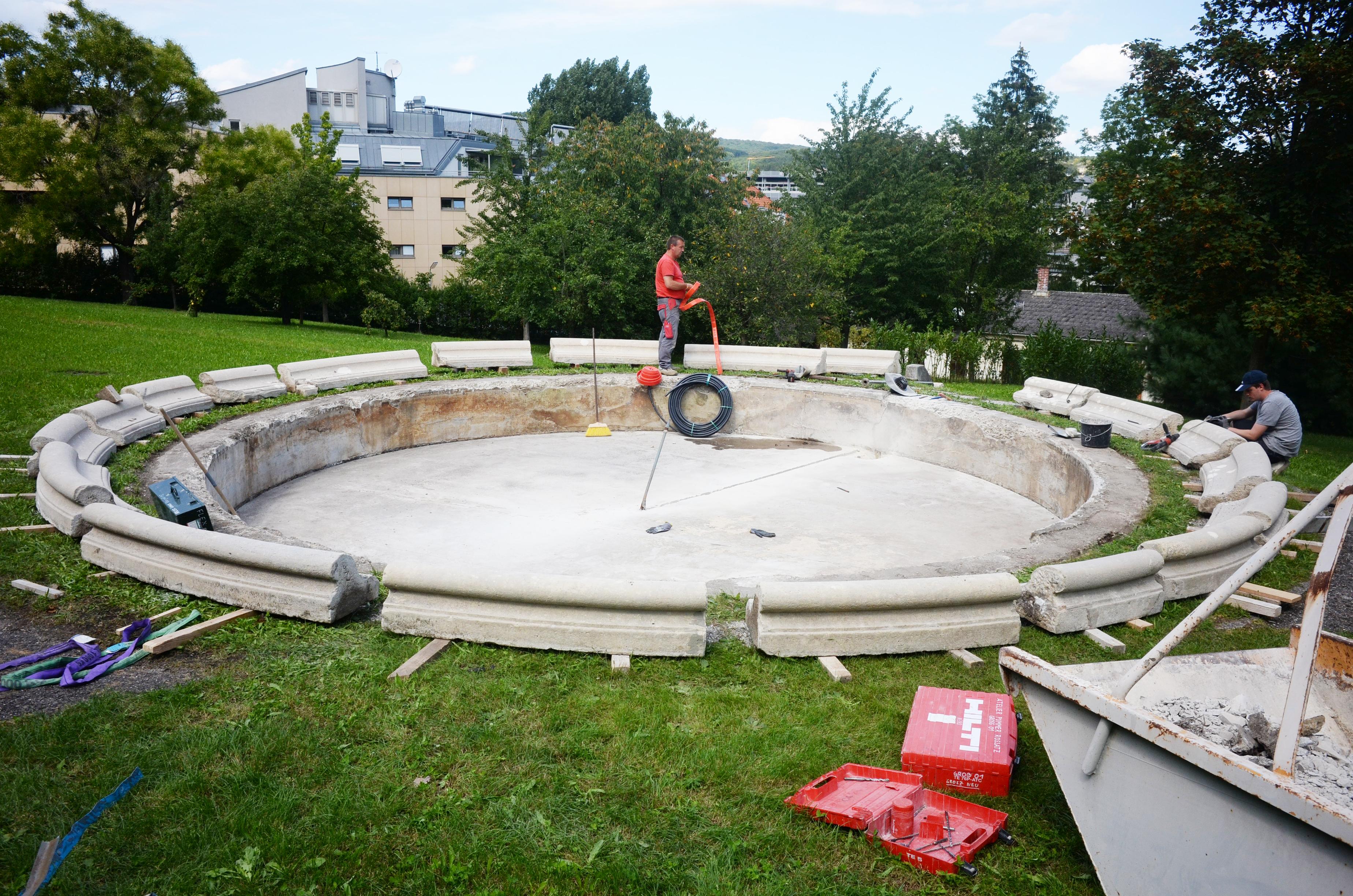 Circular, profiled fountain border made of Lindabrunn conglomerate with ∅ 850 cm. Leaky fountain basin and defective and non-existent fountain technology.Removal of the vegetation, complete dismantling of all profiles, replacement, renovation and sealing of the well basin (polymer coating), external drainage, installations (well technology, water, electricity), installation of the spring stone.