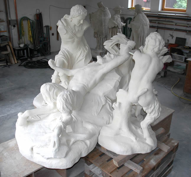 Baroque fountain, sculptures of shell limestone from Zogelsdorfer (larger than life size)Dismounting, reconstruction, production of a copy from artificial limestone, assembly