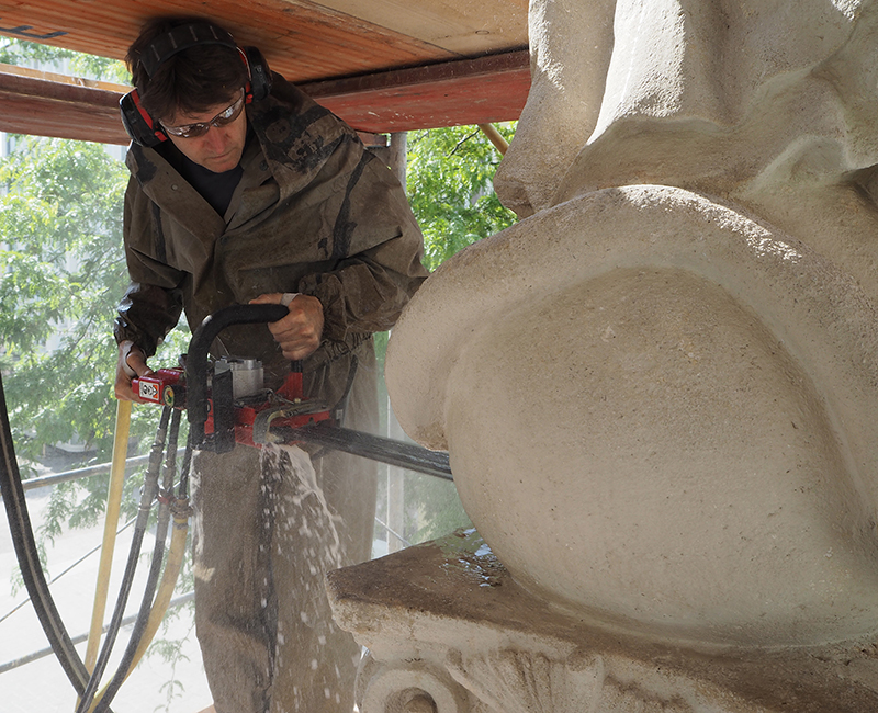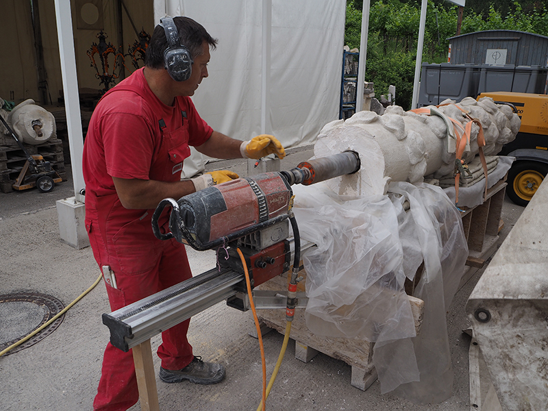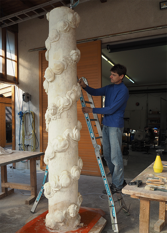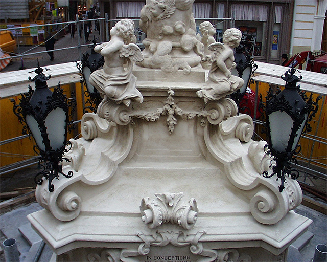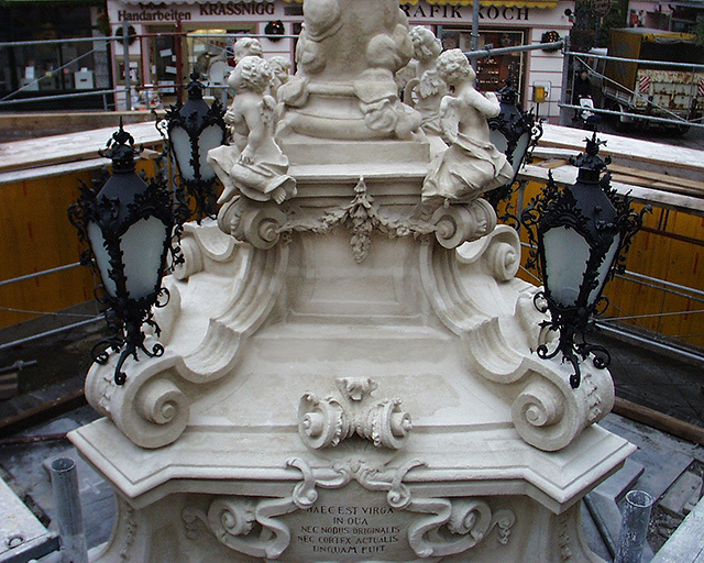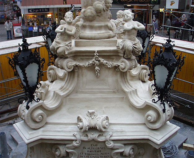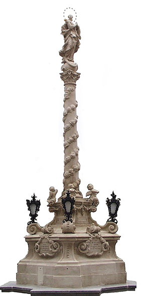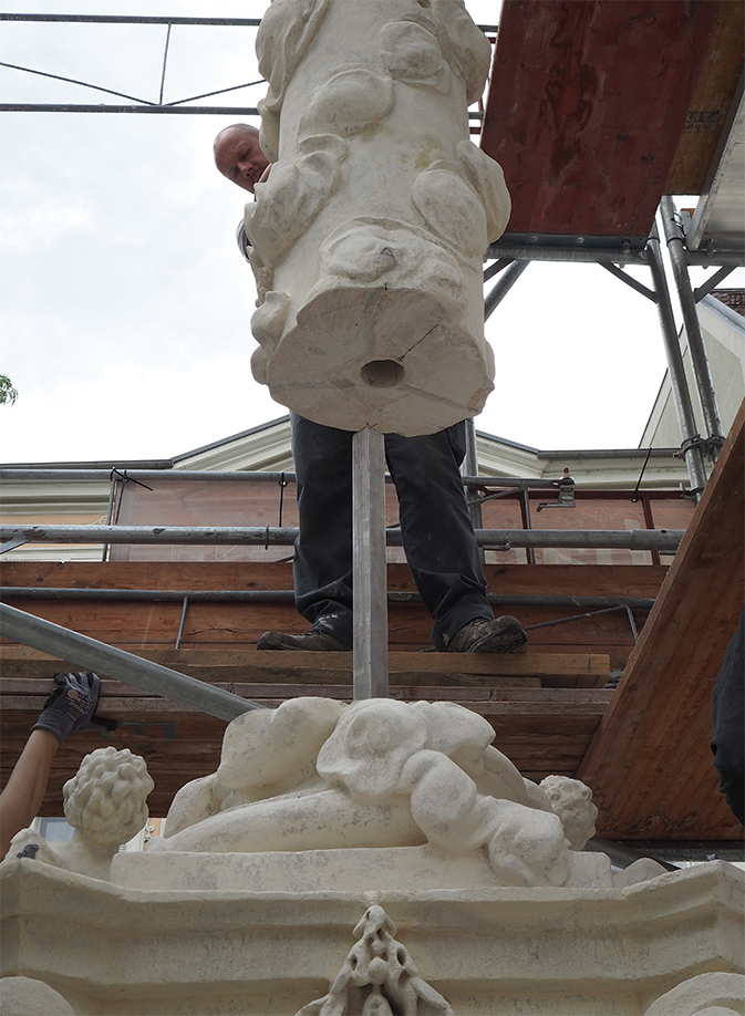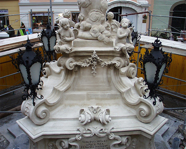 Marian column in limestone from Zogelsdorf, Baroque 1718Dismounting, preservation and appendix, re-gilding of metallic artefacts, cleansing, repairing and coating of laterns, assembling, lime-whiting