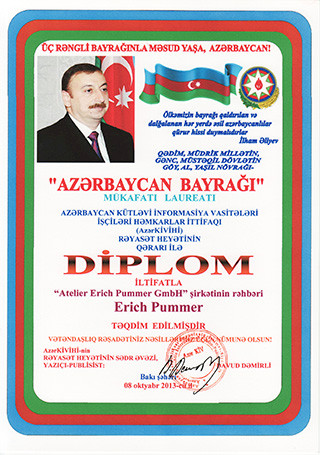 Under the patronage of the President Ilham Aliyev the Atelier Erich Pummer respectively the managing director Erich Pummer was awarded the Honorary Diploma for the excellent restoration of the Maiden Tower. The graduant is selected and proposed once annually by the Azerbaijani media…