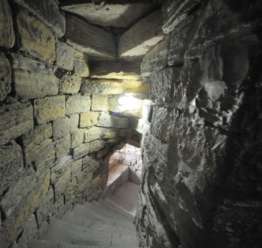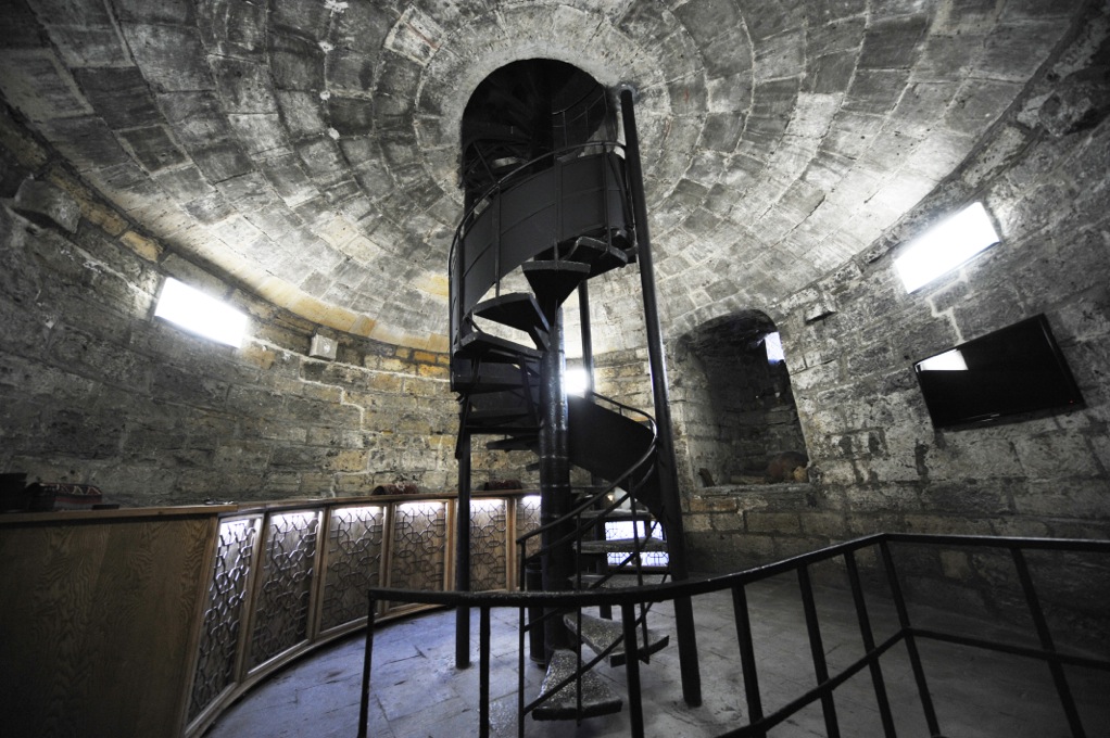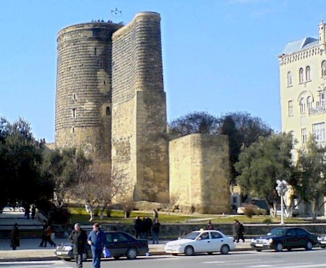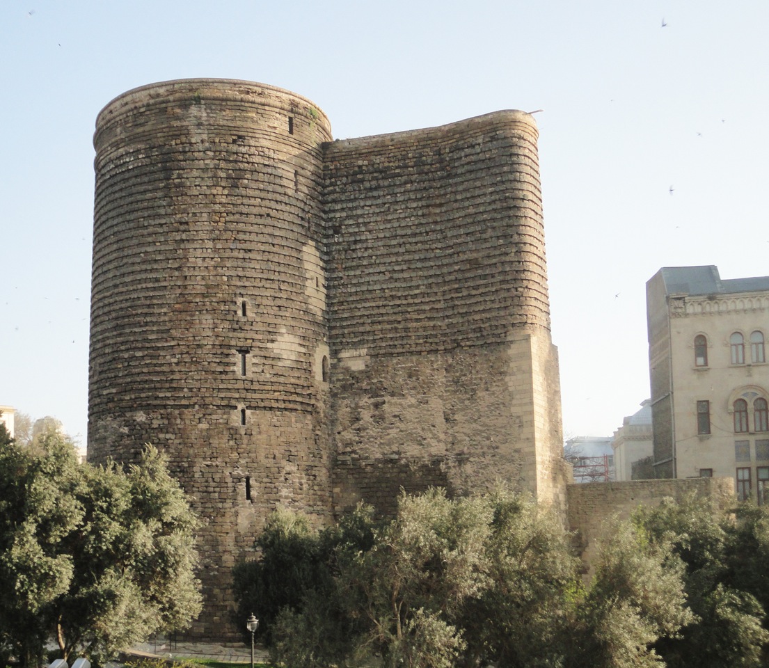 Early medieval round tower, 8 storeys, 30 m height, 15 m diameter, 5 m thick walls, inside core 7th century, building activity until 13th century.The Qiz Qalasi, known as the Maiden Tower, is located in the south-eastern part of Icherisheher, the old town of Baku, which is still partially walled today. It is probably part of the former city fortifications.