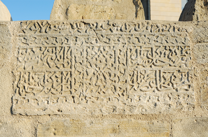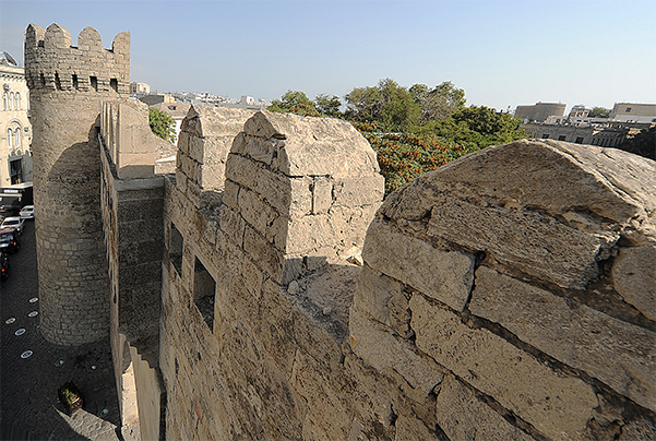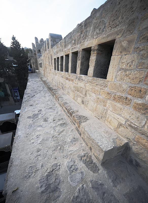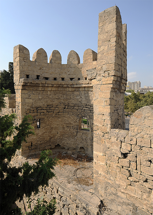 Historic Old Town "Icheri Sheher", 13th – 14th century (Silk Route), weir system with two flanking, crenellated semicircular towers and battlements, two entry gates with overlying cast openings "Maschikulis", approx. 1000 m² surface of stone blocksConservation and static renovation in situ, stabilisation of the battlements and archways's merlons made with historical building technology, crafted reconstructions, contemporary sealings of the mural crowns with lead and polymeric material