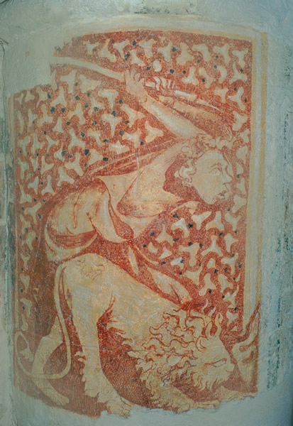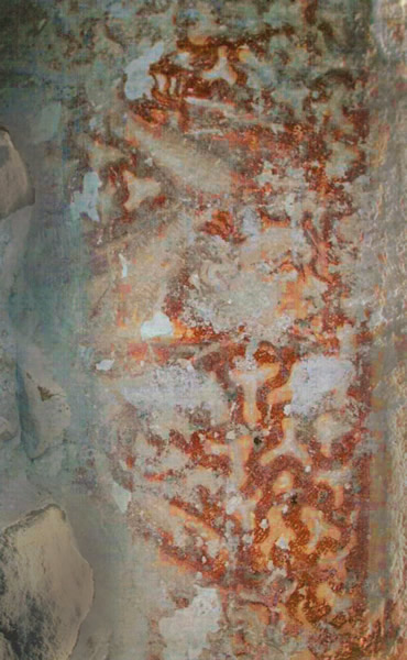 Fresco on exposed pillar, 12th centuryMen armed with spears, assisted by lions, Removal of lime layers, stabilisation, fresco retouching with watercolours