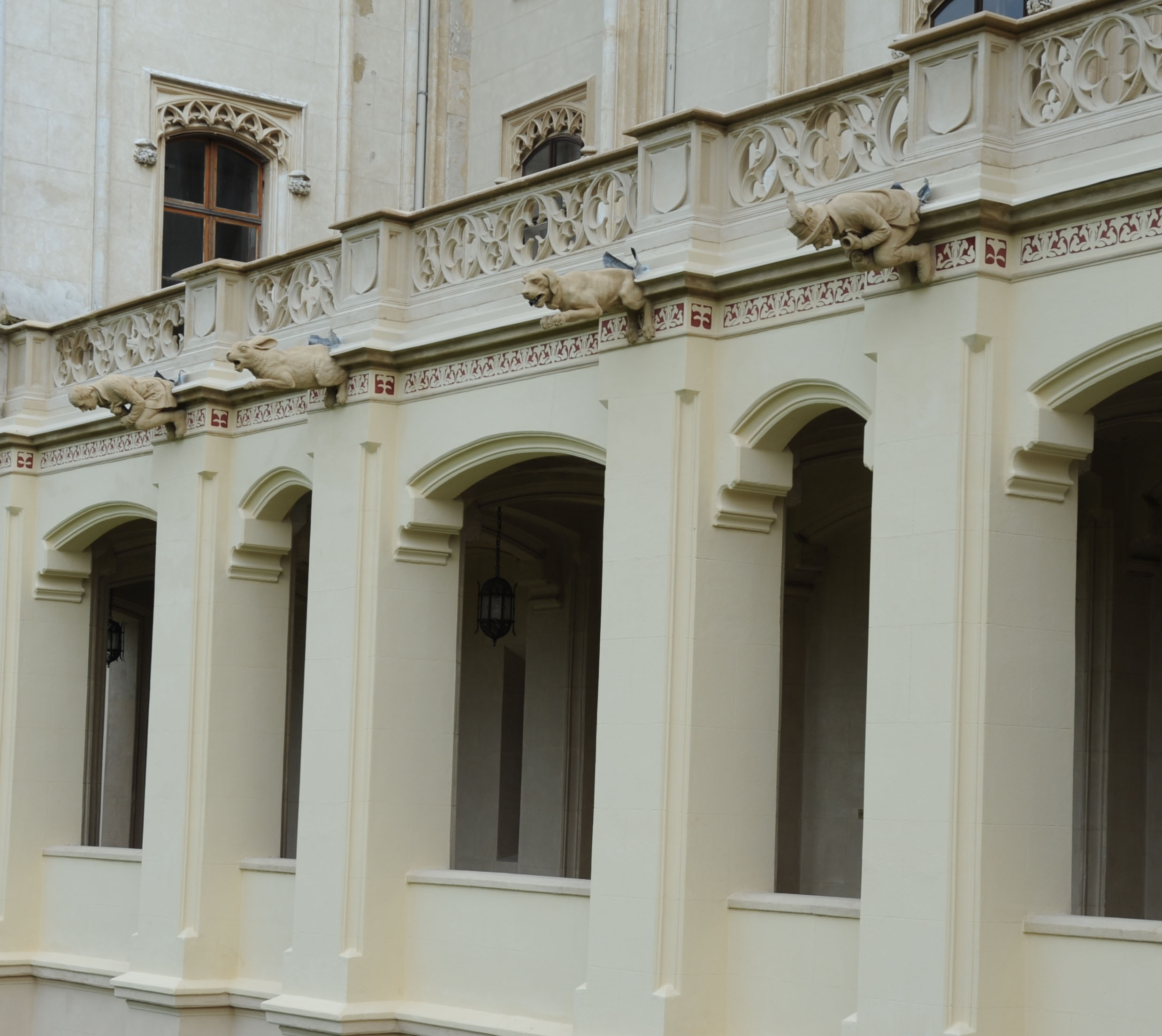 North facade, balconies with gargoyles and arcades, 1845 - 1872Gargoyle figures of St. Margarethen limestone, conservation and complement in situ, stabilization and reconstruction of ornament ribbon in lime-secco technology, plaster restoration and painting in lime technology