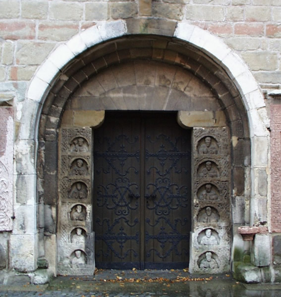Round arched gate with reliefs of apostles on the door posts, of limestone and quartz sandstone, 12th centuryLaser cleaning, desalination, integration of door post copies, presentation of the original door post in the City Museum, restoration of portal and epitaphs