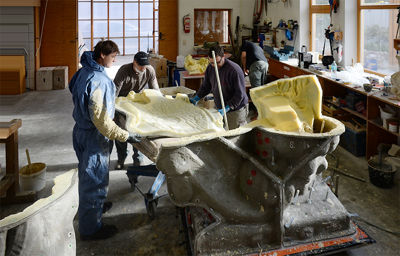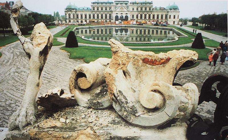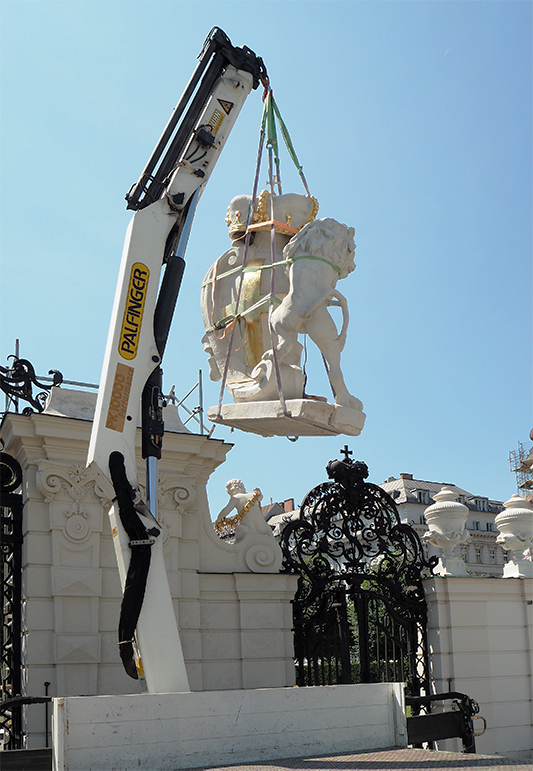 Limestone from Zogelsdorf, 240 cm tall, 1350 kg. 24 years after the last restoration, the decision was made for security reasons, to create a copy of the lion in shaken cast of artificial stone reinforced by fiberglass.In 1992 the lion fell and smashed next to a japanese tourist group. Back then the restoration was commissioned to us and all fragments were sticked together, mortised and all voids were complemented.