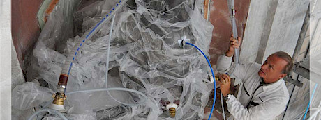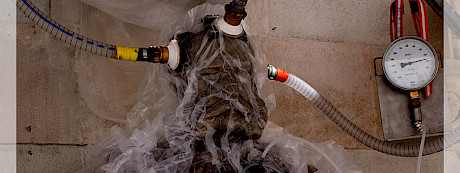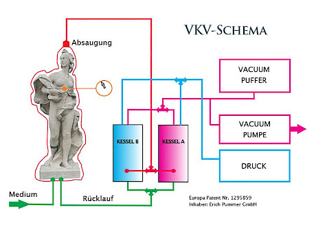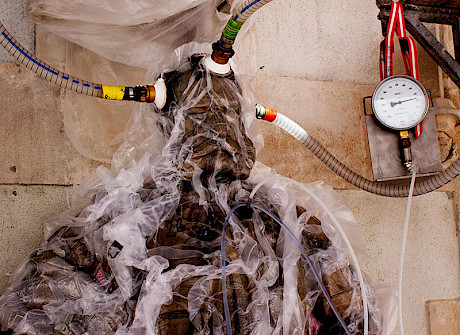 Thanks to this technology, a basic principle that has been sought in stone conservation for decades can be realised: namely, that the right quantity of new bonding agent is applied to the damaged object and, above all, is injected deep into the stone. This is fundamentally important since simple surface treatment can cause the sort of follow-up damage that is all too widely seen. This damage includes cavities of just a few millimetres that become chipped after a few years, causing parts of the original surfaces of the artwork to be irreparably lost. The objects to be treated, which can be virtually of any size, are shrink-wrapped in airtight solvent-resistant film. The remaining air trapped inside the film and within the porous cavities of the stone is then drawn out with the vacuum-circling preserver so that a vacuum is created in the object itself. After a relative vacuum of 300–900 mb has been achieved, the appropriate strengthening agent (silicic-acid ester or acrylic solution) is injected via a precise dosing system, and distributed evenly and deeply into the stone thanks to the low pressure. The open pores and badly damaged areas are filled first, while the remaining pores and capillaries in the healthy and sound material take slightly longer to fill until, finally, the stone has been restored back to its even and original strength.